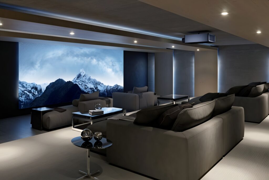 In our home cinema rooms, we install only carefully selected, specified products to ensure optimal visual and audio clarity, delivering a truly immersive and high-quality entertainment experience. Each component is chosen to match the unique acoustics and layout of the space, as well as the client’s preferences and site-specific requirements.Our projection screens are crafted using high-grade materials such as imported acoustic cloth, fiber, and LED panels, all designed to enhance image sharpness and sound precision. By using only premium materials and technologies, we create a cinema environment that looks and feels exceptional.